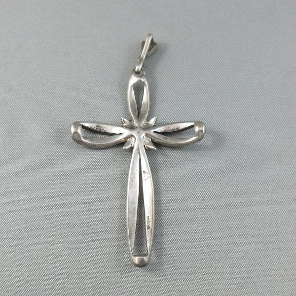 Croix travail d’excellente qualité, sertie de marcasites d’origine. Le 4 branches sont bombées forme ouverte. Le centre rappelle une forme végétale, bélière fantaisie. Signé GC.